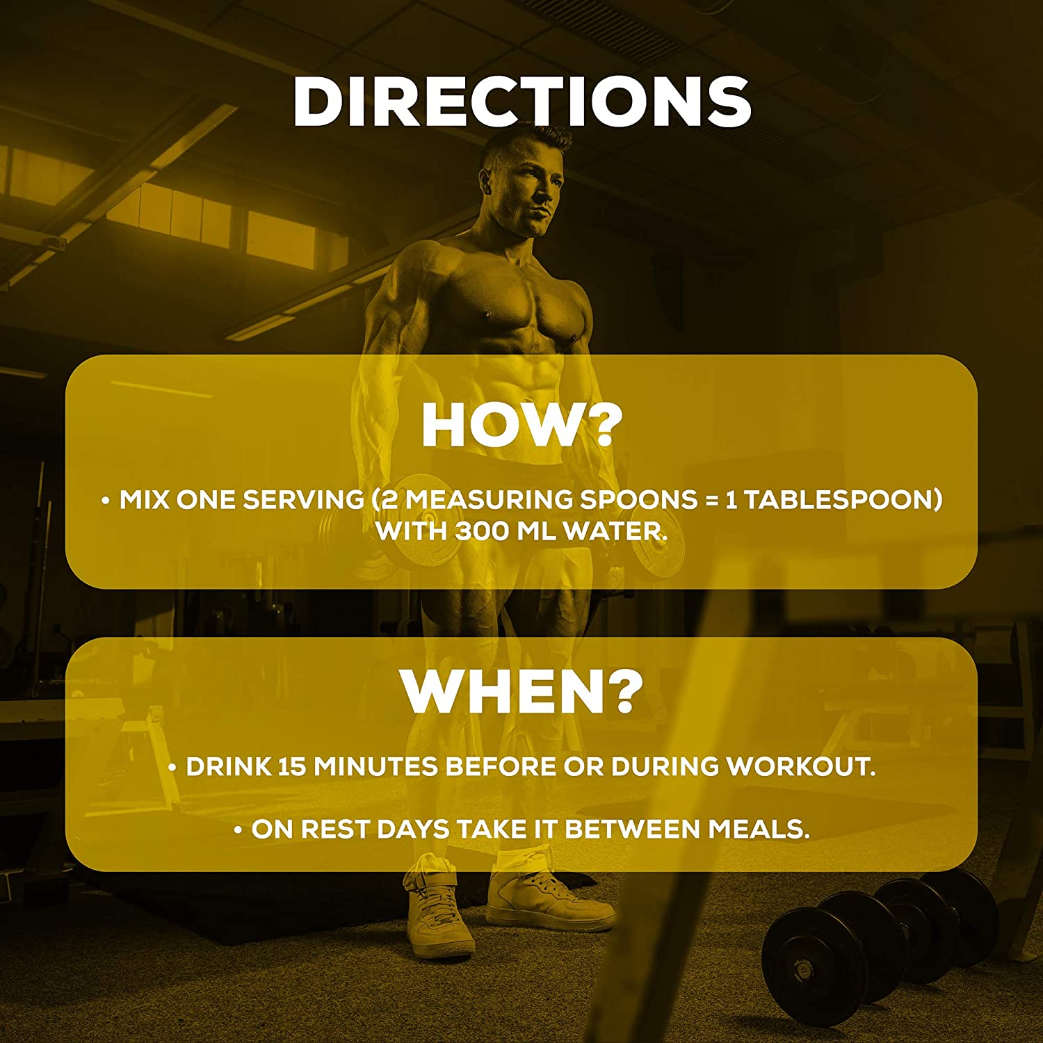 Mix one serving (2 measuring spoons = 1 tablespoon) with 300 ml water and drink 15 minutes before or during workout. On rest days take it between meals.