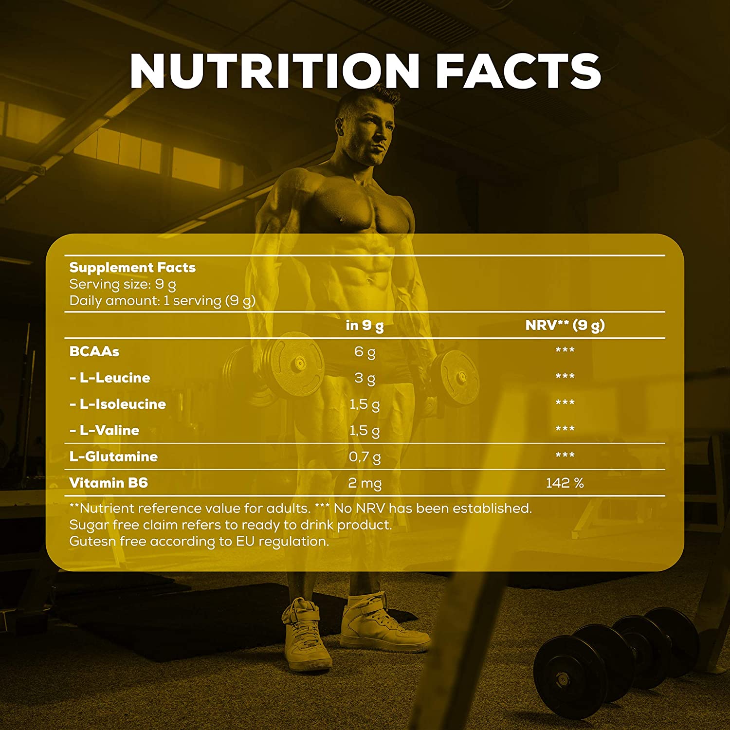 - Per serving (9 g): 3,000 mg L-leucine; 1,500 mg L-isoleucine; 1,500 mg L-valine; 700 mg L-glutamine; 2 mg vitamin B6