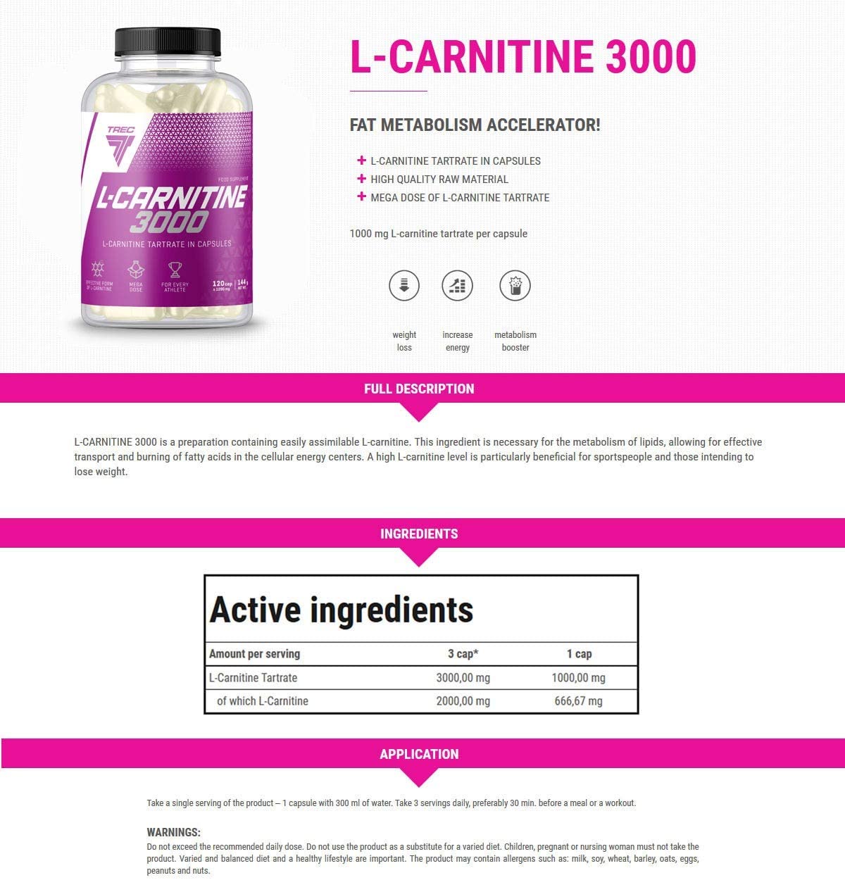 Carnitine 3000 is a preparation that contains easily acceptable Carnitine. This ingredient is a very important element for the metabolism of lipids, which makes possible an effective transport and oxidation of fatty acid in the energy centers of the cells. The high level of carnitine is exceptionally useful for athletes and people who want to reduce their weight.