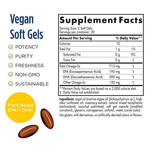 Product Description Nordic Naturals algae omega gives Vegetarians and Vegans a great way to meet their daily recommended serving of omega 3 epa+dha. To get just 500mg omega 3 epa+dha, you'd have to eat a 5 ounce bag of flax or chia seeds. That's a lot of seeds to crunch. Nordic Naturals algae omega gives you that same beneficial amount in two, certified vegetarian soft gels. Made from sustainable sourced microalgae, our algae omega formula is non GMO and hexane free. And because it contains no fish or animal products, It's also suitable for vegans. Comes 60 soft gels in a pack. Ingredients Algal oil (marine algae oil [Schizochytrium sp.], high-oleic sunflower oil, rosemary extract, natural mixed tocopherols, ascorbyl palmitate), soft gel capsule (modified cornstarch, glycerin, carrageenan, sorbitol, water, carob color).